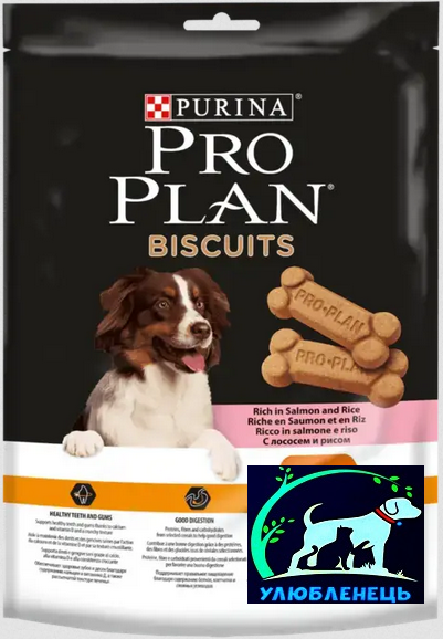 Purina Pro Plan Biscuits - додатковий сухий корм для дорослих собак. Pro Plan Biscuits з лососем та рисом створений фахівцями для собак старше 9 місяців, для дрібних, середніх та великих порід. Ласощі мають високі смакові якості та енергетичну цінність, забезпечують здоров'я зубів і ясен, а також підтримують правильне травлення собаки.