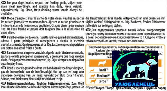 Свіжа чиста питна вода повинна бути доступною тварині у будь-який час. Наглядайте за собакою, коли даєте їй корм. Вага одного шматочка близько 10 г/g.